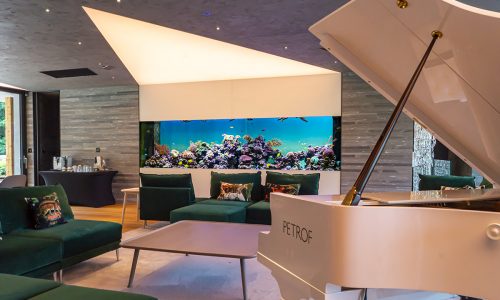 U této nádrže jsme kvůli jejímu objemu museli použít dvojité sklo o síle 2 x 19mm. V případě běžného plaveného skla (float) by taková síla materiálu znamenala již silné zelené zabarvení. Prémiové sklo Optiwhite od firmy Pilkington tento problém ale spolehlivě řeší a pohled do akvária tedy působí křišťálově čistě.